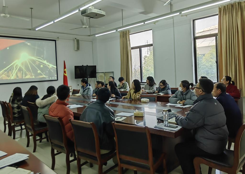 会上,全体教工观看学习专题片《永远吹冲锋号》。