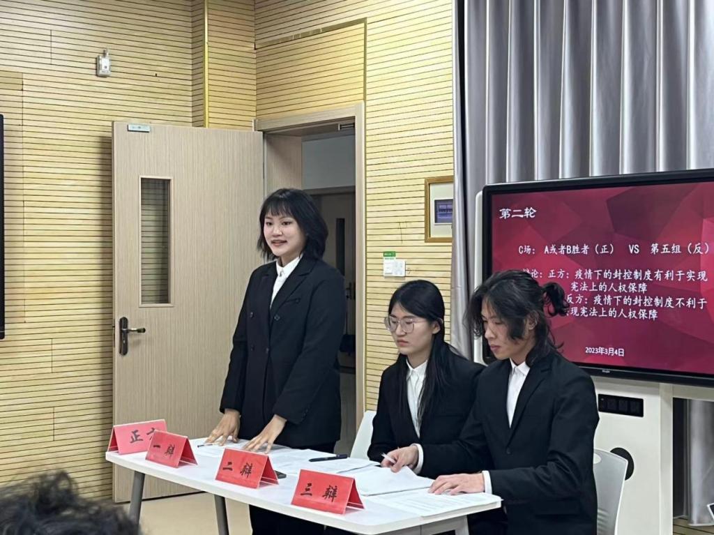 此次辩论比赛共分为五组,每组三人,共进行了四场比赛,比赛顺序由抽签决定。第一场比赛由第一组和第四组围绕“法治进程的推动,是人的提升更重要还是法的提升更重要”展开激烈辩论;第二场比赛由第二组和第三组就“网络带货中,职业打假人的存在是利大于弊还是弊大于利”进行唇枪舌战;第三场比赛由第五组与第二组进行关于“疫情之下封控制度是否有利于实现宪法上的人权保障”的辩论;第四场比赛由第一组和第二组进行最终决赛,主题为“迟来的正义是正义吗”