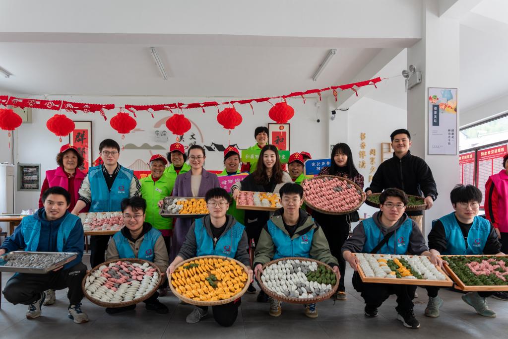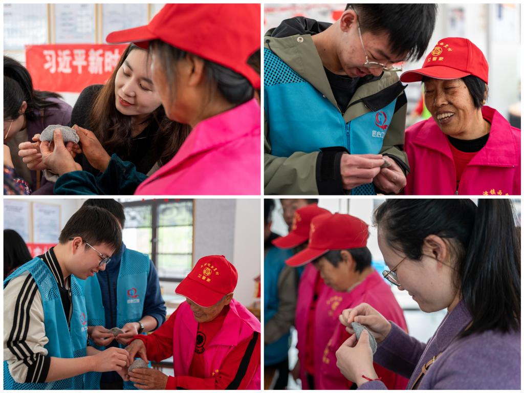 西皇村的爱心食堂里,师生党员们在志愿者的指导和协助下,顺利地将粿胚制作成各式各样的清明粿。清明粿俗称青团,它寓意春意盎然、生机勃勃,也寓意着做人、做事要清清白白。