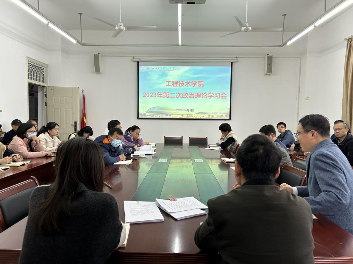 4月6日下午,工程技术学院在理工3402会议室召开2023年第二次政治理论学习会,院长彭樟林及相关负责人出席会议,会议由工程技术学院党总支书记周聪主持,全体教职工参加会议。