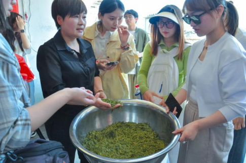 随后,师生党员来到了当地制茶工厂,亲自体验制茶的过程。“采摘回来的茶叶先要摊晾,接着就开始杀青、揉捻、反复复烘揉捻……”有着丰富制茶经验的老茶农一边为师生党员示范,一边讲解。