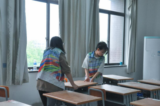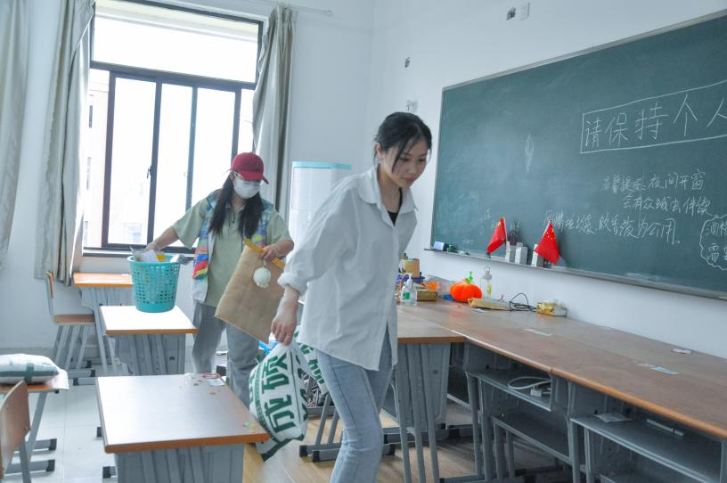 尽管天气闷热,也阻挡不了大家的热情。党员志愿者们早早地到达考研教室门口,做好打扫准备。在教师党员的带领下,志愿者们各自分配好区域,干劲十足地开始工作:地面卫生的清扫、犄角旮旯的清理、遗留书籍整理、课桌讲台擦拭清洁、考研氛围布置......大家纷纷撸起衣袖、弯下身子,对考研教室进行了全面的整理打扫。