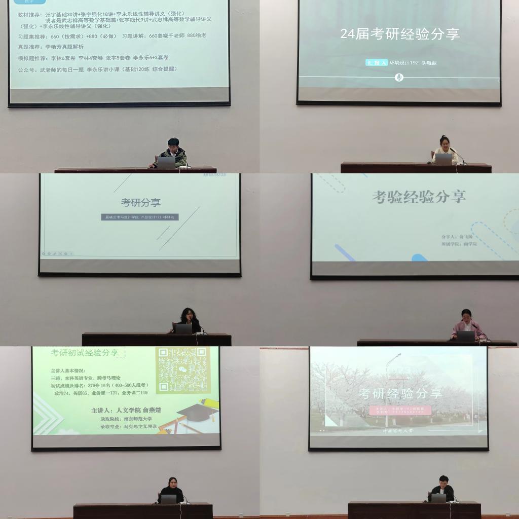 6位同学以自身经验为例,从考研动机、学习方法、择校经验、资料准备、考研时间安排、计划制定等方面为切入点,向同学们分享了考研经验,强调备战考研要加强专业知识、夯实数学基础、提高政治敏感度和提高英语阅读能力。他们认为备考期间的相互支持与鼓励、合理的时间分配和坚持到底的决心对考研成功至关重要,同时,他们还强调了良好的心态对于考研的重要性等。