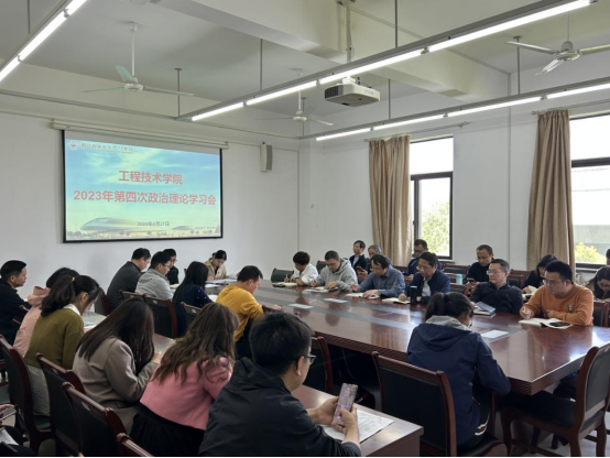 4月27日下午,工程技术学院在理工3402会议室召开2023年第四次政治理论学习会,会议由党总支书记周聪主持,院长彭樟林、副院长胡建华出席会议,全体教职工参加会议。