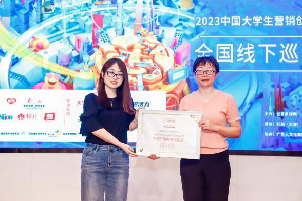 广告人文化集团市场总监孙明晖为学院颁发了“年度广告教育推动奖”,以表彰学院在该项赛事中取得的突出成绩和做出的卓越贡献,同时为学院广告学专业(专升本)2022级学生刘珈邑、陈柄妃、徐瑜、钟佳蕾颁发云南白药命题营销策划类金奖。
