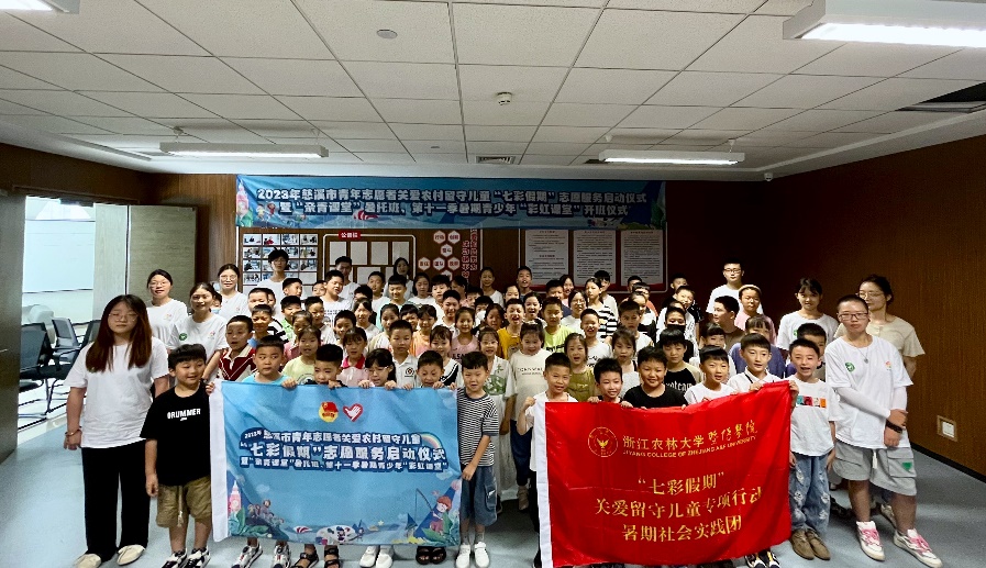 7月17日,人文学院、马克思主义学院与慈溪市团市委的志愿合作项目——慈溪市青年志愿者关爱农村留守儿童“七彩假期”志愿服务活动暨第十一季暑期青少年“彩虹课堂”开班仪式在慈溪青少年宫举行。慈溪团市委副书记马佳露、慈溪市文明办三级主任科员陈铭、慈溪市关工委常委熊建飞、人文学院、马克思主义学院团学指导教师包军宇、慈溪市青少年宫副主任丁颖静,学院“七彩假期”专项行动暑期社会实践团全体成员、“彩虹课堂”全体学员到场参加仪式。
