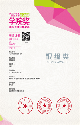 经过激烈角逐,必赢官网广告学专业学生在本次大赛中获得国家级银奖1项,优秀奖3项,入围奖4项。其中由2021级广告学专业学生来丹棋、陈星竹、陈佳禾、俞昱辰、孙嘉然、傅静雯共同创作,教师李巧苗指导的作品《45°青年拯救计划》荣获“松能”营销策划类命题全国银奖。同时,李巧苗荣获“银级类杰出指导教师”称号。