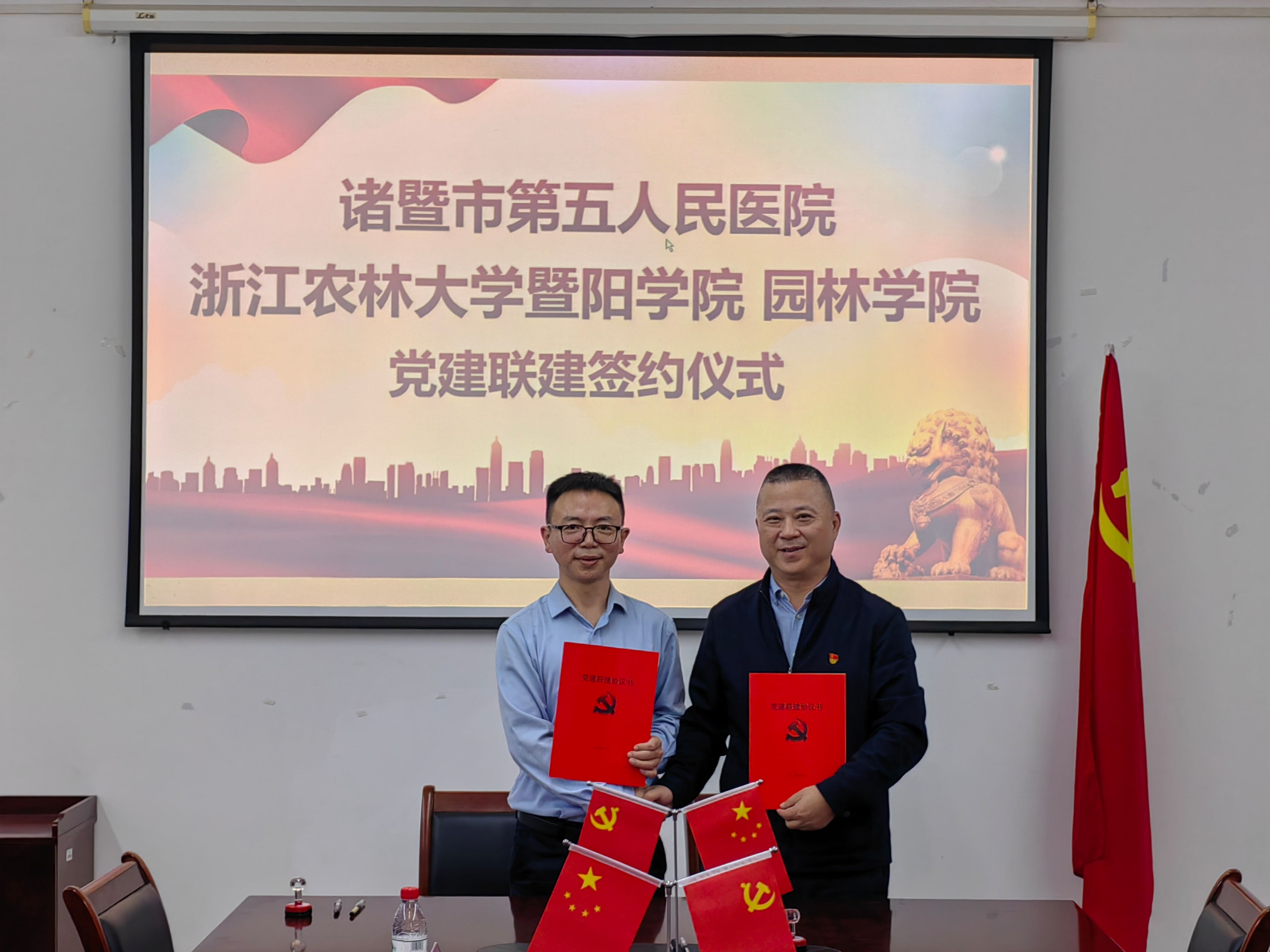 随后,园林学院党总支书记徐涌和诸暨市第五人民医院党总支书记何苗分别代表双方在协议书上签字盖章。