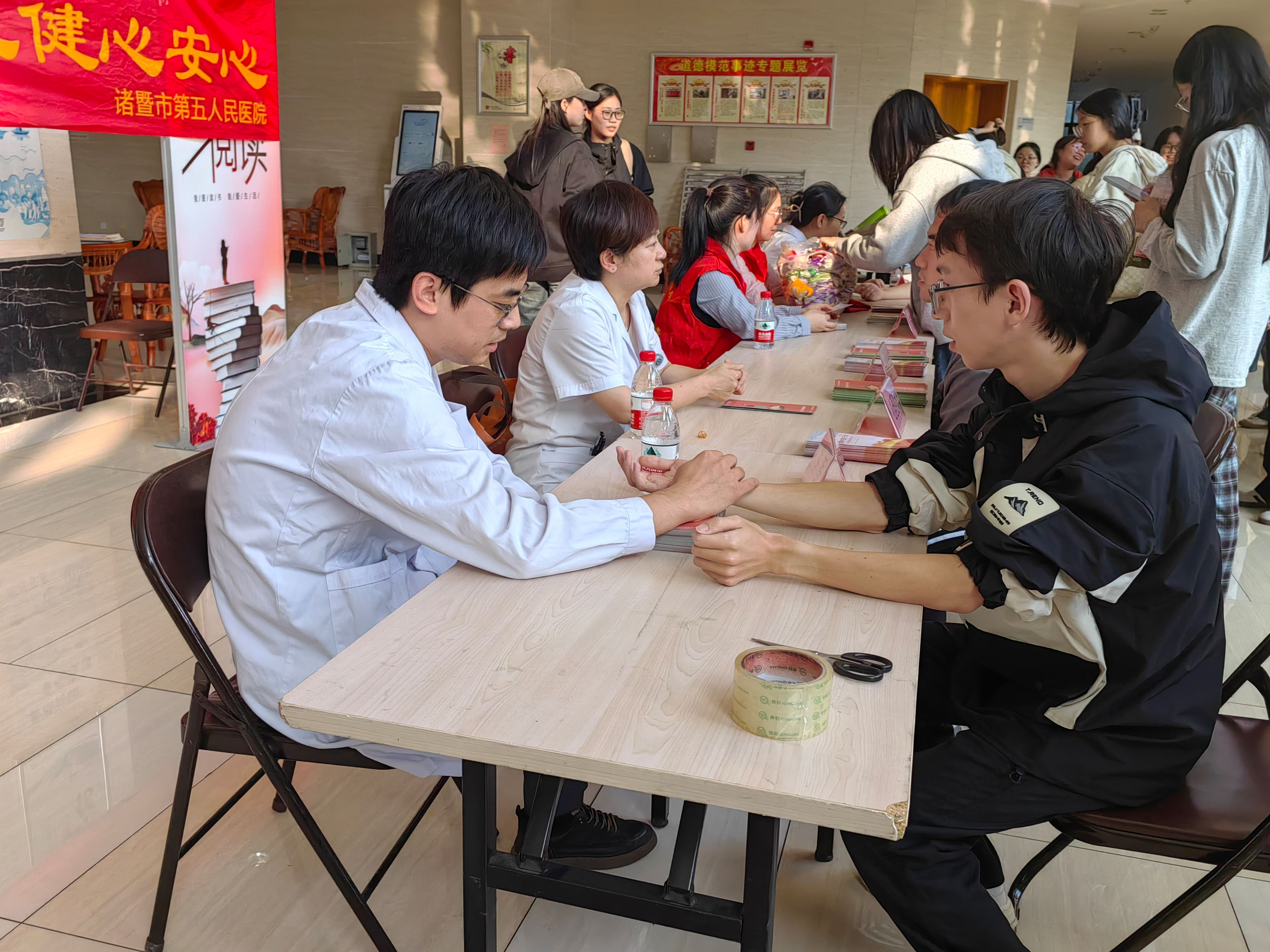 签约仪式后,诸暨市第五人民医院组织了5名专家医生团队,在图书馆一楼为学院师生们开展精神卫生日主题义诊体验活动。