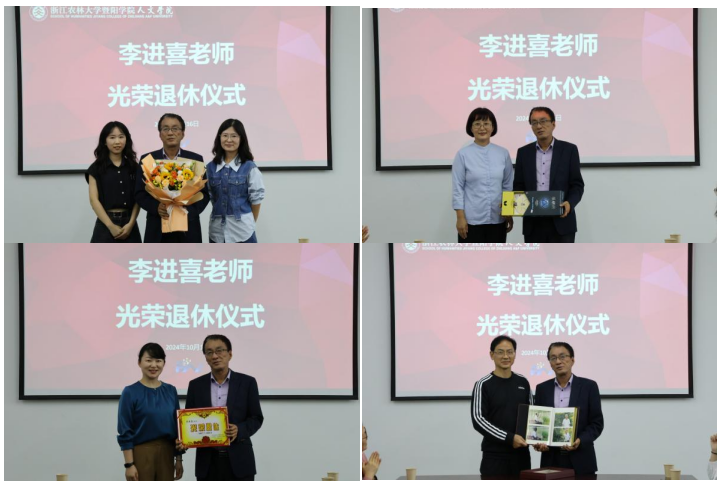 李叔君为李进喜送上荣退纪念品,徐平荣送上纪念相册,共同回忆了与李进喜一起共事的难忘时刻,表达了不舍与祝福。随后,教师代表献上了鲜花。在谈话交流中,各位老师回忆往昔,赞扬了李进喜的工作精神与为人处世,同时表达了自己对于李进喜的感谢与祝福,已毕业的学子,也以视频形式送上了他们的祝福。