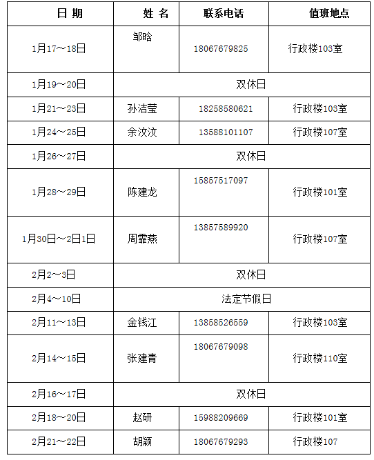 六、寒假公共保障部值班安排表如下,值班时间上午8:30—11:30 ;下午14:00—16:30。