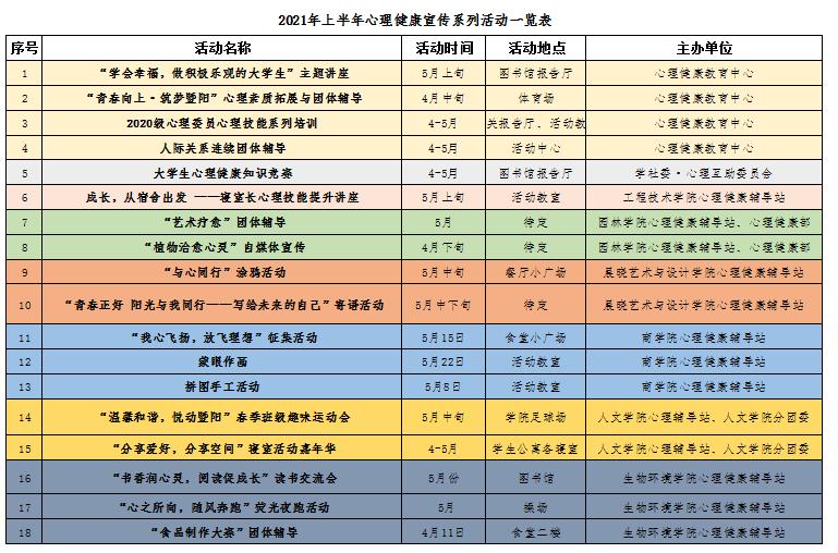 5月25日为全国大学生心理健康日,希望暨阳学子以此为契机,积极参与以上活动,主动获取心理科学知识,优化自我心理能力素质。各二级学院要加强活动宣传,精心组织各类活动,共同维护必赢官网学生的心理健康。