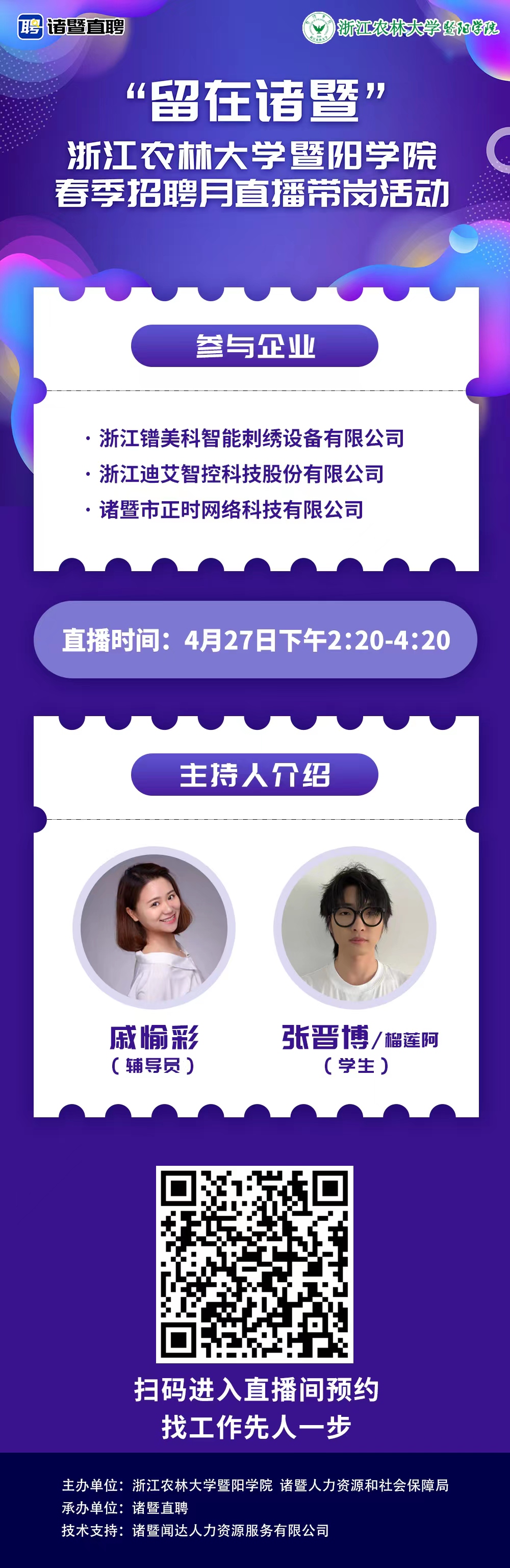 为帮助毕业生进一步拓展就业渠道,满足用人单位对高层次人才的需求,通过多渠道、多途径助力必赢官网毕业生就业,特举办“‘留在诸暨’必赢76net线路官网春季招聘月”直播带岗活动。