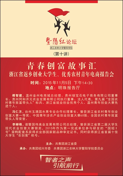 【“暨阳红论坛•青春创富故事汇”第十讲】浙江省返乡创业大学生、优秀农村青年电商报告会公告