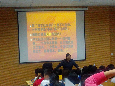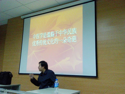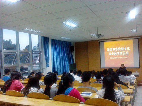 丰富广大学生的生活,开拓学生的视野,增长学生的知识,一学期来,医学系坚持每周安排具有副教授以上职称或硕士研究生学历的教师为学生开展学术讲座。交流内容丰富,知识面广,形式多样,具有很强的指导性和适用性。6月12日晚19:30,我系潘立文博士就《中国传统文化与中医学的关系》与同学们进行讲座探讨,吸引了众多志同道合的同学,甚至有检验系的部分学生专程慕名而来聆听此次讲座。讲座中,潘博士指导同学们应该以辩证的态度看待中国传统文化,而不可盲目信仰,做到取其精华、去其糟粕,并以“根氐在黄老之道,发扬自孔孟之儒,受惠于释迦之佛”为主线展开,讲解中国传统文化是儒、道、释三种流派思想长期融合而来的,三位一体,不可分割。让同学们在了解中国传统文化的背景下进而引入其与中医学的内在联系,他指出中医学直接脱胎于中国传统文化,是滥觞于中华民族优秀文化的一朵奇葩,二者唇齿相依,这是中医的一大特色,在世界文化史上独树一帜。潘博士以其渊博的学识、流利的口才、丰富的肢体语言向同学们诠释中国传统文化与中医学之间关系,展现了其独特的个人魅力和独道的见解,折服了在场的每一位同学,现场激烈而持久的掌声为这场精彩的讲座画上了圆满的句号。